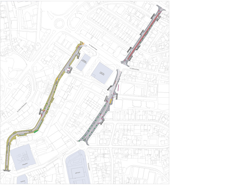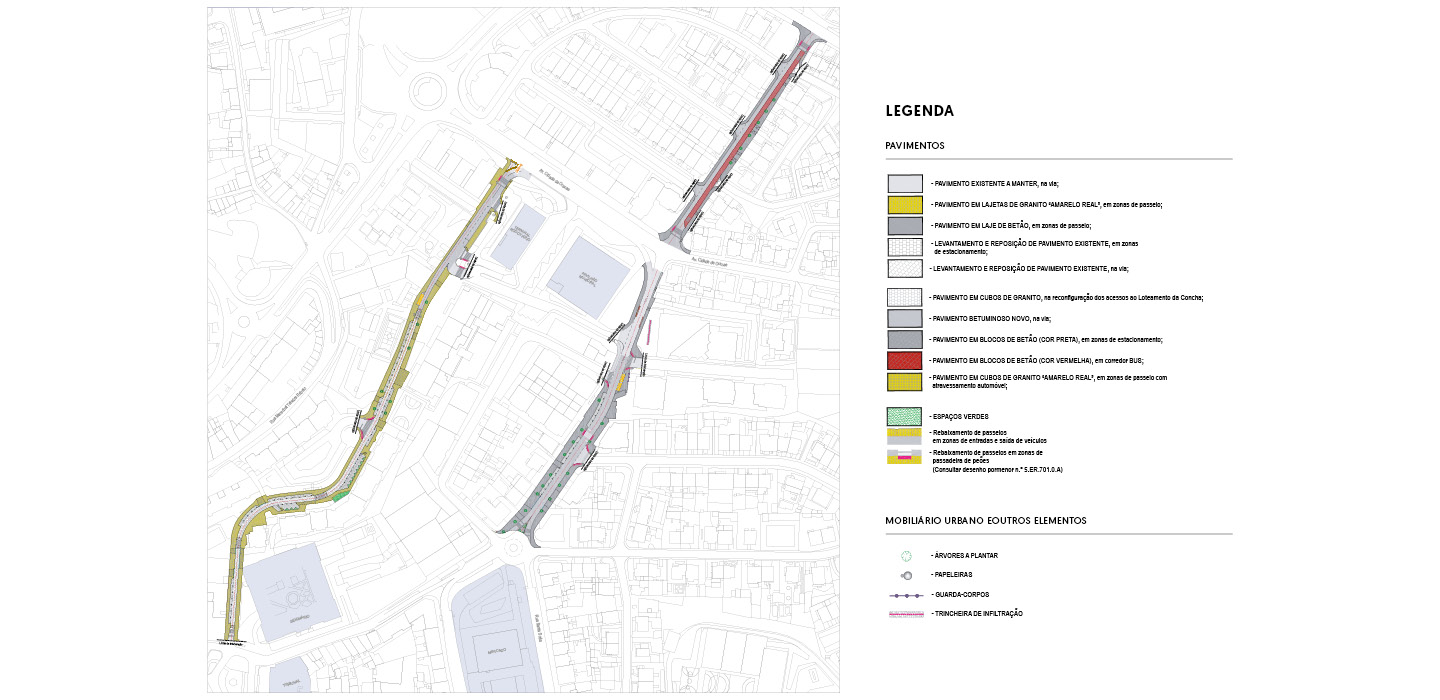 • Introdução ao nível do desenho de soluções urbanas que conduzam à diminuição da velocidade de circulação dos veículos, à melhoria da segurança no espaço público, à introdução de novos pavimentos, mais seguros e adaptados a mobilidade condicionada, à introdução de elementos de conforto climático através da arborização dos arruamentos e de zonas de descanso, e à eliminação de obstáculos à circulação pedonal e nova sinalética.